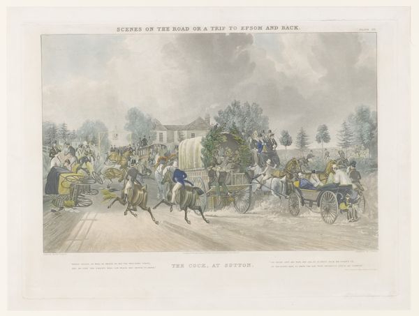 Editor: This etching by John Harris, made in 1838, is titled "Gezicht op het tolhuis bij de drukke kruising tussen Kennington Park en Camberwell New Road". It's a pretty bustling cityscape. There's so much frantic energy depicted with all the carriages and crowds of people! What do you see in this print? Curator: The dynamism is immediately striking, isn't it? Note how the artist uses a receding horizon line to establish depth. Then consider the way Harris distributes visual weight, drawing the eye into the scene with the convergence of lines, diagonals and placement of forms within the frame. How does the composition enhance your perception of movement? Editor: Well, the horses in the foreground really stand out – their poses emphasize forward motion, and the converging lines almost push you into the image. Curator: Precisely. The artist is very deliberately using graphic elements. Semiotically, you could even consider the architecture in the background, with its more rigid vertical and horizontal lines as a kind of visual anchor. Doesn't it subtly contrast with the frenetic activity happening at street level? Editor: Yes, now that you point it out. It adds a layer of complexity I hadn't noticed before. It's like Harris is playing with opposing forces within the frame. Curator: It does highlight how much is communicated just through formal elements: line, shape, composition. Even without knowing the specific narrative, the arrangement speaks volumes. Editor: I’ve learned to consider how even seemingly simple images contain carefully considered compositions and thoughtful uses of semiotic signs. Curator: Indeed. It reminds us to look beyond the literal subject matter and decode the deeper visual structure at play.