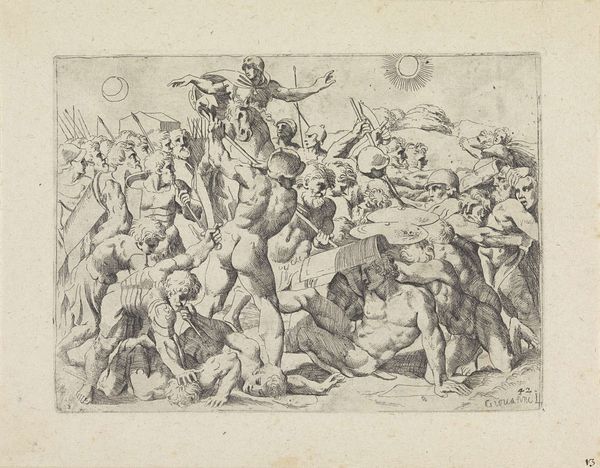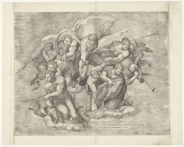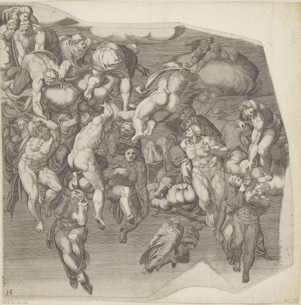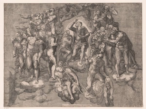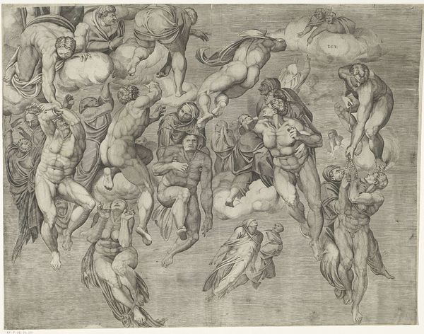 Curator: Welcome. Before us is Nicolò della Casa’s "The Last Judgement," an engraving dating back to 1548. This print, currently housed here at the Rijksmuseum, offers a fascinating glimpse into the artistic sensibilities of the period. Editor: It looks like a tumble of bodies caught mid-air. Is it me, or is there a sense of—dare I say—organised chaos to the composition? Like everyone's fighting gravity, each other, and their own skin. Curator: Indeed. Consider the historical context. Della Casa was working in a period heavily influenced by Mannerism, an aesthetic movement known for its heightened drama, stylized forms, and often complex compositions. The late Renaissance was anything but simple—politically, religiously, artistically. "The Last Judgement" embodies that complexity. Editor: Makes sense. I’m feeling overwhelmed, almost anxious, trying to untangle those limbs! There's this potent sense of unease that I just can't shake. This isn’t your serene Renaissance painting. It feels frantic. Curator: Precisely. Look closely and you'll notice how della Casa manipulates perspective and anatomy. There is anatomical exaggeration alongside almost gymnastic posturing. Editor: A few figures look like they’re mourning while hurtling down through the clouds—a touch melodramatic for my taste. Also, note the almost obsessive rendering of muscles…are these bodies blessed or damned? It is really a conundrum. Curator: Perhaps Nicolò della Casa intended it to be. Art of the era served not just as decoration but often as tools for religious or political instruction, inviting commentary about power, mortality and morality. What we interpret may not mirror how the print was originally viewed centuries ago. Editor: And the story continues through the eyes of whoever is watching…Thank you for untangling some of it. Curator: The pleasure was all mine. A little historical perspective can do a lot.