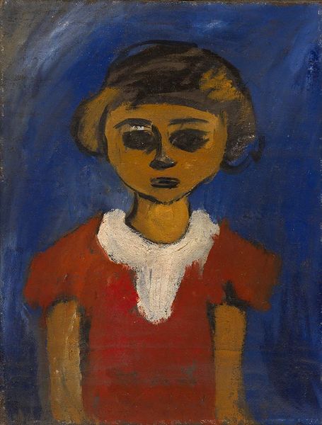 Curator: Let's delve into Paula Modersohn-Becker's "Half figure of a girl with a yellow wreath in her hair," painted in 1902. A captivating piece showcasing the artist’s distinctive Expressionist style. Editor: Oh, I get this feeling that she is a bit... melancholic. Her expression is thoughtful, her body is turned a bit, away from the viewer... yet her gaze is quite insistent. Curator: Absolutely. Modersohn-Becker was pushing boundaries, both artistically and socially. She was committed to representing women and girls not just as objects of beauty but as individuals with inner lives. This portrait sits within a larger context of turn-of-the-century debates about female identity and representation. Editor: I notice that in the piece we can find brushstrokes which are very evident, almost impatient. The colors, too! She really pops against the rather muted turquoise backdrop. The composition is interesting - so much simpler and less formal than traditional portraits. You know, there’s a rawness that gets to me. Curator: The use of oil paint creates a tangible texture, lending a unique, almost tactile quality to the piece. This was characteristic of the German Expressionist movement. More significantly, Modersohn-Becker created deeply personal connections through the portrait and captured something deeply psychological about childhood. Editor: There’s a timelessness here, wouldn’t you say? Something very real... beyond just being a visual. The yellow wreath might symbolize something as straightforward as childhood innocence, or even some special, local Worspwede custom that the young girl had to observe. I see echoes of my childhood... how beautiful it all looks back then. Curator: Indeed. The figure, caught in a liminal moment, becomes an emblem for a larger discussion around girlhood, representation, and the artist’s evolving vision. It truly exemplifies how Modersohn-Becker positioned herself as a trailblazer in early modern art. Editor: Yes, after examining this lovely painting, I have a much better sense about Paula, her feelings, and her vision. Thanks for the insights, always interesting!