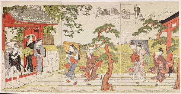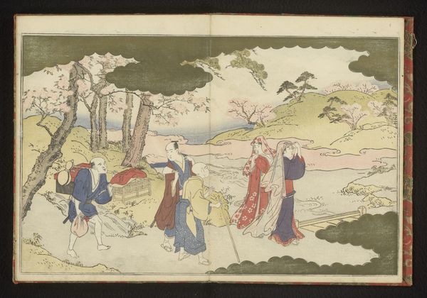 Curator: What a tranquil scene. This is "Flower Viewing" by Hishikawa Moronobu, though this print dates to 1711, it’s a reproduction of an earlier 17th-century work. Currently, it's held at the Art Institute of Chicago. Editor: It has a wonderfully relaxed and festive vibe. I notice the contrast in groups: one settled, almost in a private world, and the other a group arriving. The minimalist aesthetic gives it space to breathe. What strikes you most about it materially? Curator: I find myself drawn to the materiality of the woodblock print, itself. The layering of ink, the subtle variations in tone—it speaks to a whole workshop's worth of labour. The act of creating multiple impressions democratizes access to this image. Consider how this changes the consumption of art compared to singular painted works for wealthy patrons. Editor: Good point! Woodblock printing allowed images to circulate much more widely. Did that have an effect on artistic patronage and what kinds of scenes artists chose to depict? Were they painting for a broader public? Curator: Undoubtedly. Images such as these were no longer restricted to the upper echelons of society. The depiction of 'everyday life' gained prominence. It invites a more general public into viewing these sorts of leisurely gatherings and activities, influencing consumer culture even. Editor: So, these scenes of 'everyday life' weren't so 'everyday' for everyone, right? Were these idealized images part of a broader marketing scheme for experiences only the privileged could actually afford? Curator: Absolutely. While this piece depicts leisure, its dissemination underscores broader social and economic disparities. It creates aspirational consumer habits, shaping what's desirable, particularly for merchants, a rising class eager to emulate aristocratic culture. Editor: That's fascinating to think about. There is an enduring allure to such carefully crafted scenes, not just in their artistry but also in their reflection of—or aspiration to—a particular lifestyle. Curator: Agreed. Understanding the social and material context transforms how we understand the artwork. Editor: Definitely. It’s made me appreciate that while "Flower Viewing" might initially appear as a pleasant diversion, it is also revealing about a culture’s values and ambitions, particularly regarding labor. Thank you for that insight!
