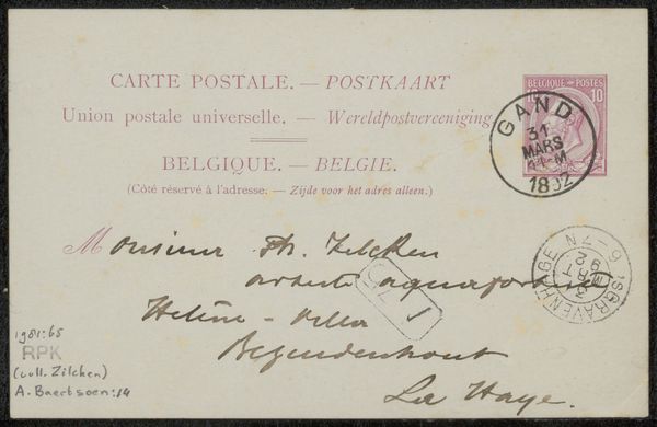 This postcard addressed to Philip Zilcken was created by Albert Baertsoen. The card is visually dominated by text and postal markings which, despite their utilitarian function, create a compelling composition. The printed text at the top, declaring "CARTE POSTALE - POSTKAART," establishes a formal grid. This is then disrupted by the handwritten address which sprawls diagonally across the card. Two circular postal stamps anchor the top corners, their geometric forms contrasting with the fluid script. Baertsoen's signature, along the bottom left, subtly asserts the artist's presence within this everyday exchange. The color palette is restrained, limited to shades of grey and pink, which enhances the historical feel. The postcard challenges our conventional understanding of art. Baertsoen elevates an ordinary object into a work of art. It blurs the boundaries between personal communication and public display, suggesting that artistic expression can be found in the most unexpected places.