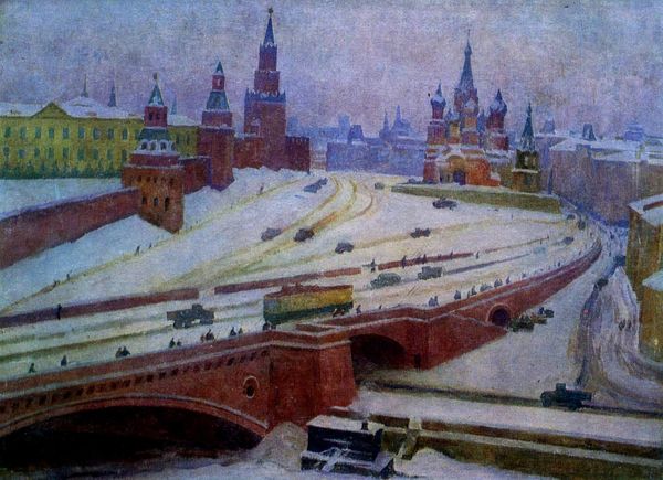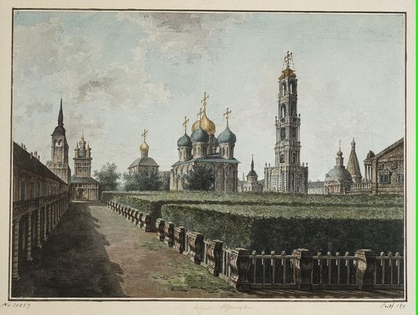 Editor: Here we have Albert Benois's watercolor, "The Church of the Gatchina Jaeger Regiment in St. Petersburg," painted in 1880. The architecture looms so grand, and yet the muted colors give the scene this feeling of wistful distance, almost like a memory. What strikes you most when you look at this piece? Curator: It’s that tension, exactly! The architectural precision married with the fluid looseness of watercolor is Benois’s way of having a conversation about time. See how the church aspires upwards, literally reaching for the heavens, rendered with the fleeting touch of Romanticism. Benois asks, does such grand architecture stand eternal or fade like a watercolour illustration? Do you see how the almost ephemeral sky embraces the firm, structured building? Editor: I do. So it's not just a pretty picture, but a meditation on permanence? The city becomes as fragile as a landscape! Curator: Precisely. He captures not just a building but a moment, laden with the echoes of history and the whisper of change. Tell me, what does that contrast – that push and pull – evoke for you? Does it perhaps speak to the fleeting nature of faith, or the solid comfort of tradition? Editor: I hadn't thought about faith that way, but I suppose these concepts become touchstones in such a fast-changing urban setting, too. I came for architectural tourism, and discovered a philosophical inquiry! Curator: It's a dance, isn’t it? We're all just trying to make sense of our fleeting existences against the backdrop of time, one brushstroke at a time. Editor: Absolutely. Now I am wondering if my memories are as vivid and strong as stone or watercolour. Food for thought.