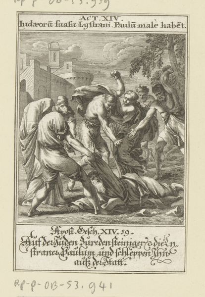 This small print depicts the stoning of Saint Stephen, made by an anonymous artist. It visualizes a key moment of early Christian history, filled with the tension between faith and persecution. Stephen, a figure of steadfast belief, is surrounded by those who condemn him, their arms raised, ready to strike. The artist captures a raw emotionality in Stephen's upward gaze, a plea for understanding in the face of brutal injustice. The print invites us to reflect on themes of martyrdom, religious conflict, and the courage to stand by one's convictions, even when confronted with mortal danger. The scene invites reflection on the intersections of religious identity and societal power. It reminds us of the historical struggles faced by marginalized communities and the ongoing relevance of these narratives in our contemporary world.