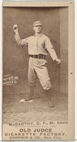 Curator: Ah, here we have "White, 3rd Base, Pittsburgh," a baseball card from the Old Judge series, created in 1888 by Goodwin & Company. Editor: It's aged beautifully, hasn’t it? There's something about that sepia tone; a quiet heroism, even in this simple portrait of an athlete. I find my eyes drawn to his posture - a classic defensive stance, weight balanced, ready to spring. Curator: The baseball card itself becomes a cultural artifact, speaking volumes about the commercialization and popularization of baseball during that era. These cards, distributed with cigarettes, turned players into icons. This "White" represents not only himself but an idea, and the very aspiration towards celebrity. Editor: Exactly. The photographic print has been mass-produced and reproduced as cheap commodities. Think of the paper quality, the ink, the machinery used. Goodwin & Co. aren’t just making images, they're participating in a vast network of labor, and it all boils down to this small rectangle we're looking at. And the players get what? Representation of the product more than representation of themselves, even in the photograph, which becomes its own raw material. Curator: He almost appears as a mythic figure from this distance. The very word "Pittsburgh" emblazoned across his chest seems to connect this player with an urban narrative beyond simply the sport of baseball. His baseball uniform functions symbolically almost like heraldry. What's really compelling to consider, in terms of its psychology and meaning for consumers, is that in turn, fans were actively curating and carrying the "White" narrative, piecing these figures together like pieces in a mosaic. Editor: It's about creating an archive, not just of baseball players, but of brands and the American pastime that baseball would become. It is about turning real players into essentially collectible material goods to be bought, traded and sold, tied irrevocably to capitalism. Curator: Looking closely, even his name, "White," functions symbolically - what’s hidden and implied in this descriptor as well during this historic moment? Editor: It also gets us to question the construction of value—a baseball card versus what now? Autographed jerseys? Different processes, vastly different commodities that circulate in new ways in the sports industry today. Curator: Indeed, from heroic symbol to market commodity— quite a trajectory revealed by simply examining this image, even today! Editor: Absolutely! You could trace nearly the whole industry from looking at one tiny sepia picture!