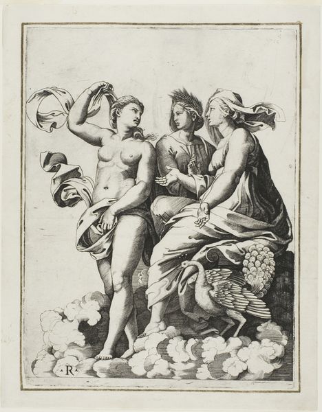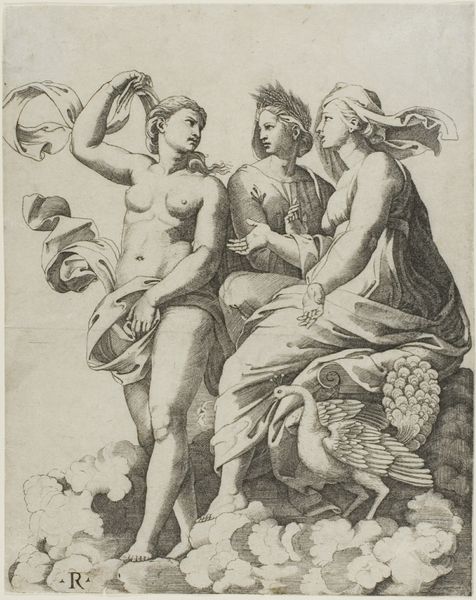Curator: What strikes me immediately is the composition, almost a classical frieze, and rendered with incredible line work. The engraving presents three figures posed amidst clouds. Editor: It feels remarkably serene for a depiction involving goddesses, actually. Considering this piece, "Juno, Ceres, and Psyche," was realized between 1510 and 1527 by Marco Dente, I'm curious, what can you tell me about its placement within its historical context? Curator: The visual vocabulary clearly owes a debt to the High Renaissance, think of Raphael. Look closely, and note the exquisite detail and balance achieved purely through the artful manipulation of line. Each figure’s posture and drapery are meticulously considered. Editor: Considering the era, the decision to represent these mythological figures in such a classical manner underscores the period’s renewed interest in antiquity. The print also speaks to the socio-cultural environment in which printmaking gained traction. Prints were tools for disseminating classical knowledge, almost like Renaissance "social media." Curator: Semiotically speaking, beyond the technical prowess, we're seeing an orchestrated convergence of iconographic elements. The positioning, gestures and interrelation of these three figures convey layers of meaning. Ceres is readily identified by the wheat wreath and cornucopia behind her peacock, as symbols of earth and prosperity. Editor: Precisely. The imagery surrounding each goddess situates them within established mythological roles. Yet, these choices would impact the broader culture, standardizing interpretations of Juno, Ceres and Psyche. By producing the engravings, it facilitated a form of cultural standardization through easily replicable images. Curator: It's the pure, unadulterated play of light and shadow across the bodies that captivates. The tonality seems entirely secondary to that masterful use of hatching and cross-hatching to shape our forms. Editor: A stark aesthetic decision reflecting the era's fascination with form and philosophical ideals regarding beauty as connected to higher intellectual insight. It also prompts thoughts about access and distribution as crucial socio-historical elements in Renaissance society. Curator: So much can be unraveled with a deep viewing and understanding of linear structure, compositional devices and sheer technical finesse within art. Editor: Yes, indeed. Understanding prints like this means unpacking both artistic intentions and historical and cultural reception as deeply intertwined, with both impacting societies.