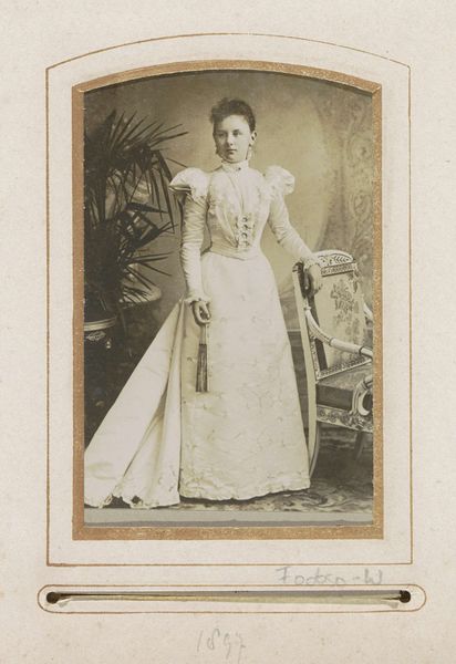 The Webster Bros. captured this woman in a photograph, presenting her standing gracefully by a chair. Her attire, particularly the puffed sleeves, speaks to the fashions of her time, yet echoes the silhouette of eras past. The emphasis on the shoulders harkens back to classical statuary, the female form sculpted to convey power and beauty. Note how she lightly rests her hand on the chair, a subtle gesture of control and poise. This positioning also brings to mind countless portraits where subjects are depicted with similar stances. Consider how such a symbol - the hand on a chair - recurs in various guises throughout art history. It may signify rest, support, or even an assertion of authority. The recurrence of such gestures transcends time, revealing a continuity in how we express ourselves. The image engages us on a subconscious level, tapping into a collective memory of beauty, poise, and the performance of social roles. And so, the wheel turns: these gestures resurface, evolve, and take on new meanings.
