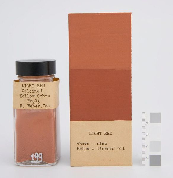 Editor: Here we have "Red Lead (Minium)" by Howe & French, Inc. It's a striking juxtaposition: a vibrant jar of pigment next to a muted, painted sample. What's your take on how the artist presents the material itself? Curator: The work foregrounds the inherent qualities of the pigment. Note the stark contrast between the raw, saturated color in the jar and its diluted, textural application on the panel. Editor: It's almost like a before-and-after demonstration. So, the value lies in experiencing the pigment in these different states? Curator: Precisely. The artist invites us to consider the metamorphosis of color and texture, and the transformative potential of material. Editor: I see! It makes you appreciate the physicality of artmaking. Curator: Indeed. By isolating and presenting the pigment in this way, the artist directs our attention to the fundamental elements of painting itself.
