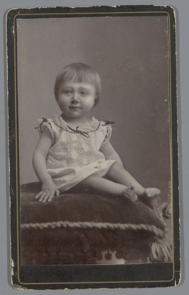 Curator: Let’s turn our attention to a piece held here at the Rijksmuseum—a gelatin silver print made sometime between 1900 and 1908, entitled “Portret van Marcel Bowi, 18 maanden oud,” attributed to Adolphe Zimmermans. Editor: The first thing that strikes me is the child's stoic expression. It’s almost confrontational for a portrait of such a young person. The vintage aesthetic amplifies the almost forced maturity implied here, don't you think? Curator: I’m more interested in the composition. Notice the careful arrangement of textures: the lace of the dress, the backdrop, juxtaposed with the solid form of the chair. Consider how this interplay serves to structure the photograph, to direct our gaze. Editor: But can we ignore the societal context? Studio portraiture, particularly of children, reflected aspirations of class and respectability at the turn of the century. The elaborate clothing, the formal pose—these communicate specific ideals and speak volumes about the subject's social position. The image's inherent value is intertwined with these dynamics. Curator: Undeniably, but to fixate solely on social implications risks overlooking the sophisticated manipulation of light and shadow. It defines form and establishes depth within the two-dimensional space. Look at the gentle gradations that model the child’s face. Editor: Agreed. But by ignoring the symbolism in the fashion, we may as well be blind. What stories are concealed or revealed in the layers of ruffles, the big, cartoonish hat? Fashion acts as a potent nonverbal language capable of expressing more than an art critic may suggest. Curator: Language is a tool in this artist's arrangement; what does it say about perspective when an artist employs visual techniques to elicit the same sensation in the eye? Editor: Perhaps this photograph encourages discourse between formal interpretation and social narrative. It prompts contemplation on identity, representation, and power in both historical and contemporary contexts. The very act of creating and preserving images shapes cultural memory. Curator: Perhaps that also suggests that there is nothing new under the sun? Editor: Exactly, to truly examine the world's visual cues is to see humanity's common denominators, decade after decade.