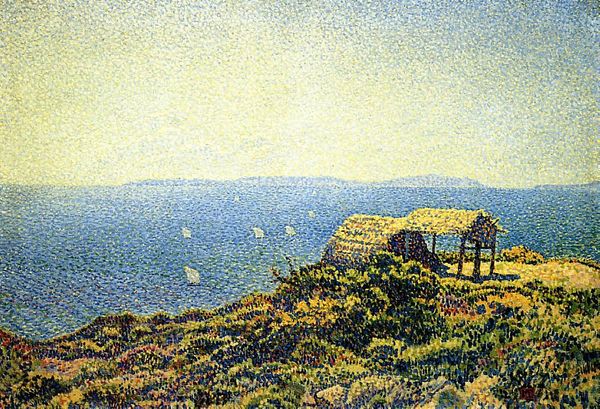 Jean Metzinger made this painting of a landscape with oil on canvas. Look closely, and you'll see it's made up of thousands of tiny dots of color. It's almost dizzying, isn't it? Like he was trying to capture not just the scene, but the very act of seeing itself. I'm drawn to how Metzinger uses color to build form. The way he layers blues and purples to create depth in the water, then juxtaposes that with the warm yellows and oranges of the shoreline. There’s a tree right in the middle, look at the shadow on it, how it’s made up of lilacs and light greens, the shade of spring. It reminds me of Seurat, but with a bit more energy, a bit more fizz. Like Metzinger couldn't quite contain himself within the rigid structure of pointillism. There's a looseness here, a sense of play that I really dig. It’s like he's saying, "Yeah, I can do the dots, but I'm gonna do 'em my way." Art's all about finding your own way, right?