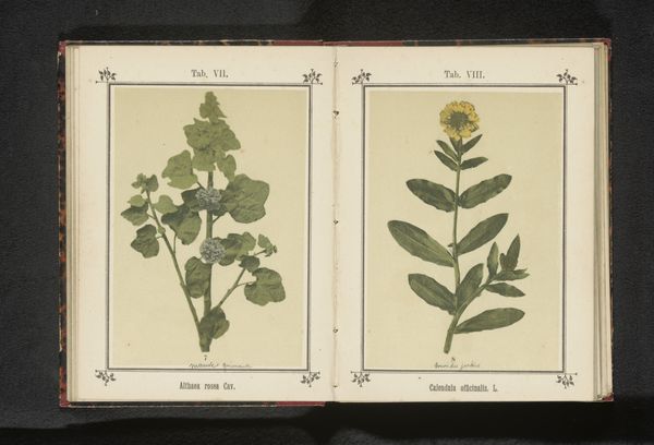 This is an illustration of ‘Geel nagelkruid en echte kamille’ from an unknown artist using printmaking, presented as two pages in an open book. The composition is neatly bisected, each side a mirror of botanical studies. Notice the structured layout, with each plant carefully isolated in its own bordered frame, a stark contrast to their natural, interwoven existence. The artist employs a limited color palette, primarily greens and yellows, which enhances the structural clarity of the plants' forms. This formal decision draws our attention to the minute details of their leaves and stems, transforming natural specimens into graphic signs. Consider how this meticulous depiction flattens and reinterprets nature according to the visual language of botanical science. The structural approach invites us to ponder the relationship between observation and representation. The choice of printmaking, a medium of reproducibility, raises questions about standardization and classification. Art does not offer fixed meanings, but rather invites continuous interpretation through its visual structure.