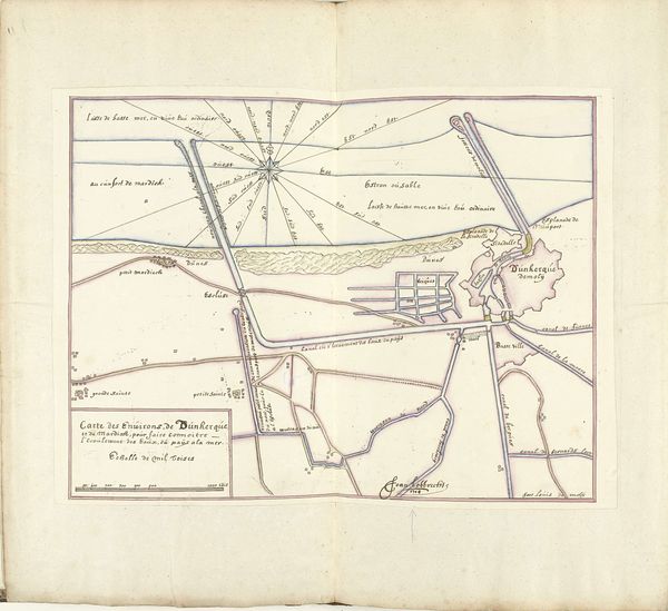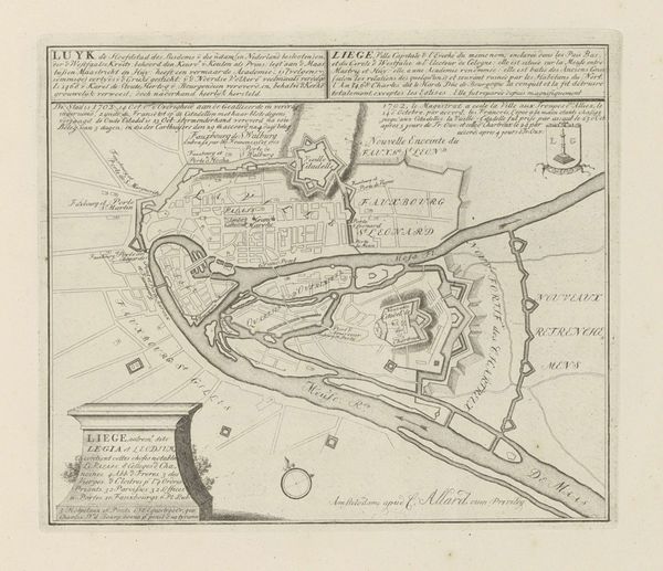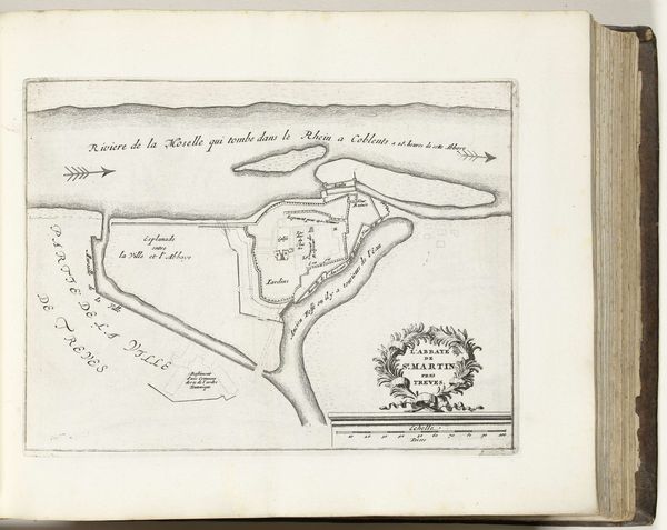 Curator: Here we have a plan of St. Martin’s Abbey near Trier, rendered in 1726. It’s a beautiful example of Baroque cartography. The delicate lines of the engraving articulate the abbey's relationship to the surrounding rivers and city. Editor: The ink on this drawing looks faded, almost spectral. There's something mournful in its presentation of what I imagine was once a vibrant center of religious life. You immediately see its placement amidst waterways as a point of connection. Who controlled that access, and to what ends? Curator: A compelling point. Let's examine how the layout uses spatial arrangement. Notice the deliberate lines that form the fortifications and architecture; they denote power through visual hierarchy. The abbey's strategic positioning at the confluence of rivers isn’t arbitrary; it’s a statement of its control and influence, geometrically and physically. Editor: Indeed. The map is less about geographic accuracy and more about communicating power. Who commissioned this? What would they gain by asserting this presence in ink? It becomes a blueprint not just for a building, but for social control, a visible manifestation of the Church's reach. Curator: Precisely. It’s also interesting how the engraving employs linear perspective to flatten space and make legible different parts. Look at how even though it's an "aerial" view, the buildings maintain readable facades—essential for portraying the grand scale and visual impact of the Abbey's architecture. Editor: But what about those beyond the walls, outside this designed space? What impact did this structure have on the lives of those who did not benefit from the church's protection? The engraver gives the waterways such expressive character as to dwarf human inhabitants outside the abbey walls, no doubt to assert that the structure is enduring as its physical context changes. Curator: Such maps give insight into what aspects of urban space architects sought to amplify as lasting achievements of form and function. Editor: Agreed. These maps not only guide the viewer through physical space, but provoke questions about power and spatial politics that ripple even into the present day.