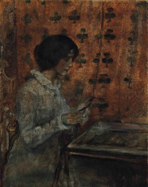 Editor: Here we have Silvestro Lega's oil on canvas, titled "Portrait of a Woman". The way she is holding what appears to be a cigarette seems to define her character; what do you see in this piece? Curator: The figure, particularly with that cigarette, enters into a rich discourse on modernity and changing social roles in the late 19th century. Public perceptions of women, especially through art, underwent significant shifts. A question to consider is: how does Lega’s portrait reflect or perhaps challenge the expected roles and representations of women at the time? Editor: So it’s a kind of commentary? It feels like it goes against typical depictions of women. Curator: Exactly. Tobacco use, especially in a portrait, carries cultural weight. We must ask ourselves: does the cigarette symbolize liberation, a break from societal norms, or something else entirely? It's crucial to remember, representations of women and tobacco have evolved over time. Can you sense any irony in how Lega's work has been received or interpreted differently throughout the decades? Editor: Hmm, maybe now the smoking looks a bit rebellious? And back then it was showing progress, and maybe independence... It’s pretty cool how art can make us look at norms. Curator: And consider the setting, lighting, and even the impasto technique: they add to the mood and narrative, contributing to this social conversation about women in society. Editor: It really brings the character to life, showing us what life could have been back then! Curator: I think it makes the familiar feel unknown, and it challenges viewers to question their assumptions about that era.