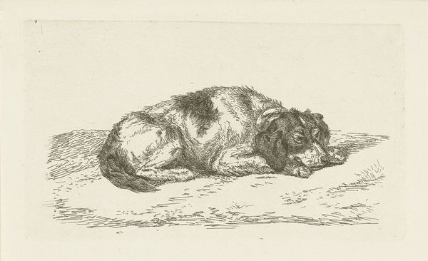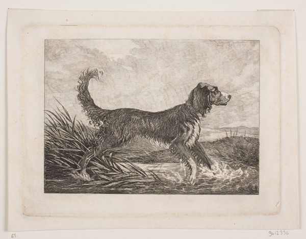 Curator: This is "Dahlfeldt," an engraving by Christian David Gebauer, created in 1821. What's your initial read on it? Editor: Immediate impression: dynamism! It really captures the explosive energy of a leaping dog. There’s an unrestrained freedom suggested by the outstretched body and that bushy tail. Curator: It's fascinating to see how depictions of animals reflected societal values and shifts. The work gives us a glimpse into 19th century Denmark where the landed gentry enjoyed hunting and portraying the ‘sporting dog’ became increasingly popular. Editor: Absolutely, this canine in full stride certainly projects qualities desired by owners—loyalty, spirit and drive. The tail itself functions almost as a flag, signalling these very characteristics! Consider also the breed itself, a clear indicator of social standing. Curator: And in terms of social representation, it is worth considering who acquired images such as these. Prints, particularly engravings, made art accessible to a broader audience. Editor: Yes, the symbol of the noble hunter became attainable for more than just the elite. It's worth noting the sparse landscape: tufts of grass, suggesting a hunting ground. This dog is forever captured at its peak. It is quite powerful, as an enduring symbol of both nobility and vitality. Curator: Precisely, making "Dahlfeldt" an object of artistic admiration but also cultural consumption. The image helps further spread this vision, these idealized qualities linked with hunting and the natural landscape. Editor: A vital example of visual vocabulary in action, spreading associated meanings outward into culture itself. Seeing such energy forever arrested in time still thrills, isn't it interesting? Curator: It speaks to our persistent cultural fascination with both animals and symbols, doesn’t it? Editor: It truly does; a surprisingly energetic little artifact that resonates across centuries.