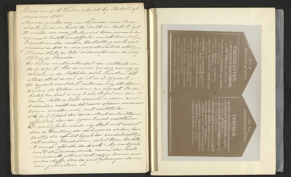Editor: Here we have "Moeder en kind in klederdracht uit het koninkrijk Napels," or "Mother and Child in Traditional Dress from the Kingdom of Naples," dating back to 1830. It appears to be a print on paper. What strikes me immediately is the texture of the paper itself; it feels aged and fragile. As an art historian, what aspects draw your attention most? Curator: Indeed, the materiality is quite evocative. More specifically, this appears to be a printed catalogue page. Observe the rigid structure imposed by the columns of text. Each block, defined by typography, presents distinct information – perhaps titles and prices? Note how these discrete units, contained within the frame, contribute to the overall composition. This emphasis on structure reflects modernism through rigid organization to flatten out traditional pictorial space. Editor: So, you're seeing the structure and its flatness before any representational element. Do you find it significant that these descriptions may be tied to corresponding works? Curator: Precisely. Consider the interplay between text and image, or in this case, potential imagery. Each textual block functions almost as an abstract shape, creating a visual rhythm across the page. How the forms and placement of typography on a flat support result in its effectiveness and overall communication of form and function is the key focus. Editor: It’s interesting to consider the piece as shapes creating a rhythm and not necessarily its value as documentation of a sale, which brings me back to this discussion of semiotics we recently had. How can we be sure the structural elements intended were this important at the time this catalogue page was printed? Curator: This piece demonstrates an essential modernist perspective, where form precedes function and where the focus lies on a detailed analysis of intrinsic visual elements such as a printed typography rather than external elements. Considering semiotics in relation to these compositional devices and how they make meaning, might shed light on both intentionality and broader impact this piece presents. Editor: This approach really reframes how I view not just this work but printed works generally. Thanks for that shift in perspective. Curator: My pleasure, viewing art from various approaches expands its interpretation.