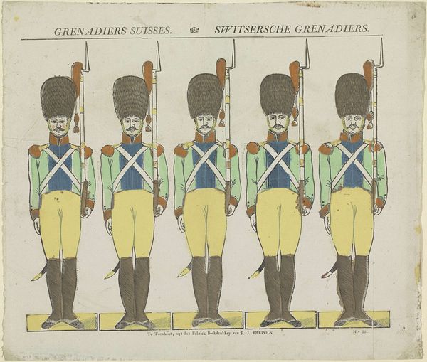 Willem Carl Wansleven created "Switsersche Grenadiers," a print of five Swiss Grenadiers. The print serves as a window into the social and political context of the late 18th and early 19th centuries. These figures, standing rigidly in formation, embody the ideals of duty, order, and discipline valued in military service. Yet, their presentation also raises questions about identity and representation. As Grenadiers, these men were part of an elite fighting force, often associated with notions of masculinity and national pride. How might their individual identities be shaped by the demands of military service and the expectations of society? Consider the personal stories and experiences of individuals who served as Grenadiers during this time. What challenges and sacrifices did they face, and how might their experiences have differed based on factors such as social class or regional identity? Wansleven's print invites us to reflect on the complexities of identity and representation within the context of military history.