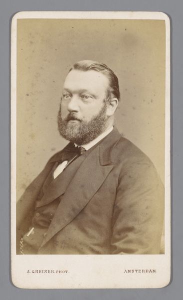 This is a half-figure portrait of the sculptor Sopers, created by Joseph Dupont. The photograph is characterized by a subdued palette, dominated by sepia tones that lend a vintage feel. The subject's dark coat and full beard contrast gently with the muted background, drawing our attention to his face and posture. Dupont masterfully employs light and shadow to define Sopers's form, highlighting the texture of his hair and beard, and the contours of his face. The composition is structured around a balance of dark and light, with the sitter positioned slightly off-center, creating a sense of dynamic equilibrium. This compositional choice reflects a broader artistic concern with capturing individual likeness and essence. The photograph's dimensions, just over 10 cm in height and 6 cm in width, position it firmly within a tradition of intimate portraiture. It invites close inspection, not just as a record of a person but as an artifact embedded with cultural and artistic codes. The study of such photographs continues to evolve, offering us new ways to understand the interplay between art, identity, and representation.