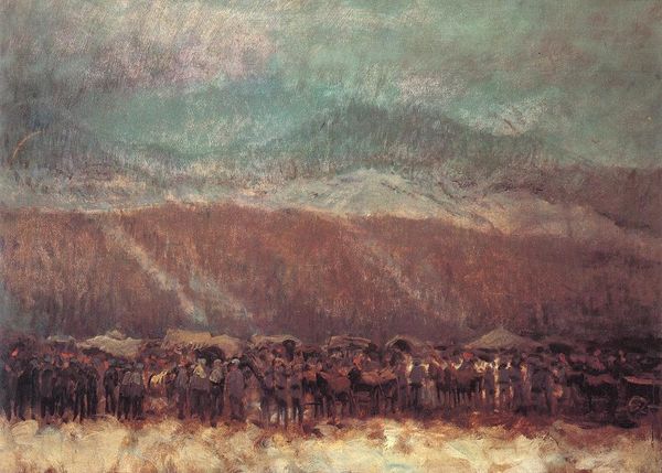 Charles M. Russell likely crafted this painting using oil on canvas. It captures a dramatic scene from the American West, featuring a group of cowboys attempting to manage a cattle stampede. The material of oil paint, with its rich texture and ability to capture light and shadow, enhances the chaotic energy of the moment. Notice the way Russell uses broad, sweeping brushstrokes to depict the movement of the cattle and horses. This technique not only conveys a sense of urgency, but also hints at the immense labor involved in ranching. Russell was deeply familiar with the techniques of painting but also with the realities of cowboy life. The painting reflects the social and economic context of the time, portraying the vital, yet often dangerous work that cowboys undertook to manage the vast herds of cattle that fueled the burgeoning meat industry. By focusing on the techniques and the work embodied in the painting, we can see how "high art" connects to the wider world of labor, economics, and everyday life.