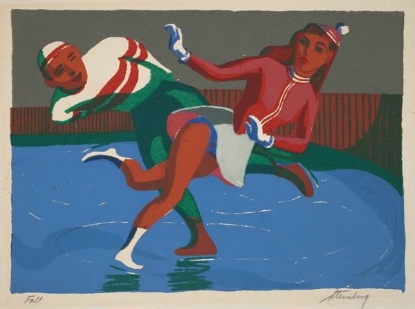 This screenprint was made by Jacob Lawrence, for the 1972 Munich Olympics. The print shows a relay race with dynamic, angular runners. It's fascinating how Lawrence simplifies the forms but captures the energy and movement of the athletes. I love the palette, how the limited range of greens, reds, blues and browns pop against the cool gray of the track. The colours are flat, applied in large, solid areas, which gives the image a graphic, almost poster-like quality. The texture is smooth and uniform; it’s hard to see the hand of the artist, which makes it feel modern. There’s a striking contrast between the rounded forms of the runners’ bodies and the sharp angles of their limbs. I find myself looking at the blue and red shoe in the lower left corner. See how the colours are mirrored in the runner's vest? It brings a sense of balance to the whole composition. Lawrence’s use of simplified forms and bold colors reminds me of Matisse. Both artists share a love for flattening space and emphasizing the decorative potential of color and form, focusing on the human form in motion. Ultimately, the print celebrates the power of art to capture the essence of human experience through simple, yet evocative forms.