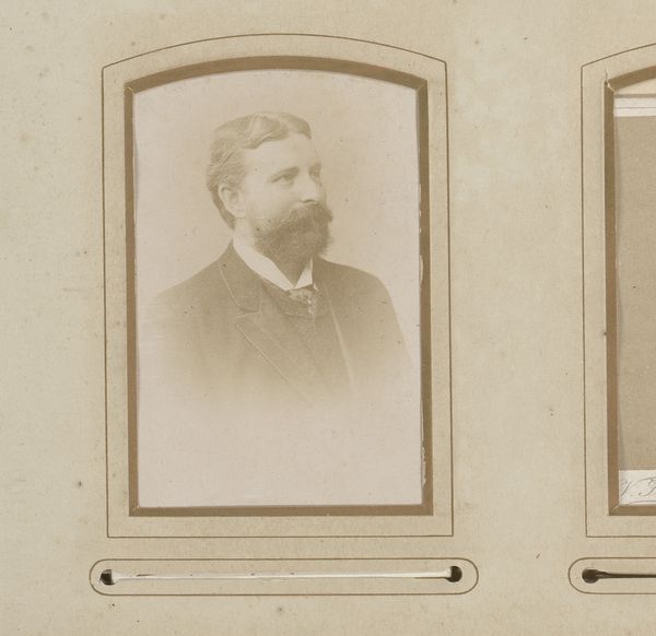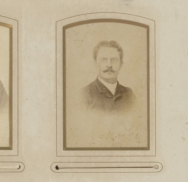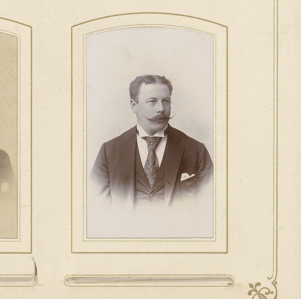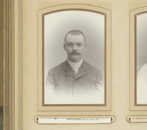 Editor: This is a photograph, titled "Portret van een man met snor," made between 1892 and 1906 by Machiel Hendricus Laddé. It's a gelatin silver print. There's something very direct and formal about this man's gaze; it makes me wonder about his story. How do you interpret this work? Curator: Immediately, I'm drawn to the moustache – such deliberate cultivation tells us so much about the man’s self-image and the prevailing fashion. Beyond the personal, though, facial hair, particularly at this time, acted as a powerful signifier. How does the image of a man with a meticulously groomed moustache resonate across different cultural understandings of masculinity? Editor: I hadn’t thought about it as a cultural signifier before. I guess I saw it more as just a personal choice, a bit of flair. Curator: It’s both, isn't it? Personal expression is always filtered through the lens of culture. The starkness of the photograph— the limited tonal range—emphasizes the details. Consider the gaze, as you pointed out, and how photography offered new modes of self-presentation and commemoration. What psychological impact does photographic portraiture have in solidifying identity for both the subject and the viewer? Editor: That makes sense. The photo feels more 'real' and intimate than a painting might, even if it’s carefully staged. Curator: Exactly. The cultural memory is held within these types of personal photographs. What strikes you now, looking at the work again with this in mind? Editor: I see the way he's carefully presented, aware of how he wants to be seen, almost creating a character. Curator: Precisely. And that intersection – the person, the performance, and the prevailing cultural expectations – creates a rich, layered image, one that continues to resonate with meanings today. Editor: That gives me so much to think about regarding how even "simple" portraits carry complex cultural messages.