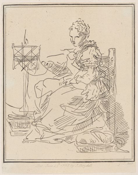Jean Jacques Flipart created this print, "The Embroiderer," sometime in the 18th century. It captures a woman absorbed in her needlework, a common domestic scene of the era, yet it invites us to consider the subtle layers of gender and class at play. During this time, embroidery was not merely a pastime but a critical aspect of a woman's identity and social role. It symbolized domestic virtue and skill, marking her place within the household and society. The woman's downcast gaze and posture suggest both concentration and perhaps the constraints of her expected sphere. The scissors hanging from her waist, a tool of her trade, also hint at the delicate balance between creativity and confinement. Consider how the image reinforces or gently pushes against the traditional roles assigned to women. There’s a quiet tension here, an invitation to reflect on the personal and emotional dimensions of women's labor. It subtly questions the narratives of domesticity.