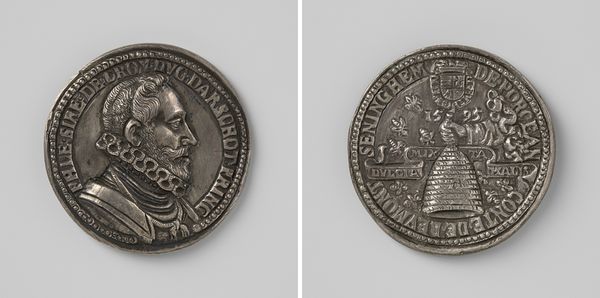 This is a silver medal by Andele Andeles, commemorating Willem IV’s appointment as a knight. Its circular form, with a diameter of just 3.5 cm, contains a complex interplay of heraldic and figurative elements. The medal presents two distinct faces, each meticulously detailed. On one side, we observe dual profiles, suggesting a duality of power or perhaps complementary aspects of Willem IV's persona. The inscription encircling these figures adds a layer of semantic complexity. The reverse side bursts with heraldic symbols arranged in a circular pattern. This design likely represents the alignment of Willem IV with established orders and territories. The medal is not merely an aesthetic object but a sophisticated encoding of power, lineage, and political ambition. The circular format and heraldic arrangement speak to a world where every form and symbol carries significance, reflecting a society deeply invested in visual language as a tool for communication and authority.
