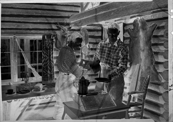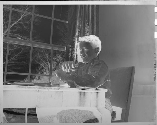 Curator: Here we have an untitled photograph by Lucian and Mary Brown, portraying a family—parents and a young girl—posed in front of a house. Editor: It's striking. The inverted tones create a rather ghostly atmosphere, and the strong contrast really emphasizes the textures of the stone wall. Curator: Absolutely. Consider the social context; family portraits of this kind often reinforce conventional roles. The parents seem engaged in quiet domesticity while the daughter stands slightly apart, a subtle hint at emerging individuality. Editor: I’m drawn to the formal arrangement. The rule of thirds is subtly at play, with the figures distributed across the frame, balanced by the architectural elements. This brings a sense of stability, even in the negative space. Curator: I agree. But thinking about it through a feminist lens, one might question who is absent from this image, whose story is not being told, to understand it more completely. Editor: A fair point. Although the play of light and shadow, inverted as it is, captures a specific, almost dreamlike aesthetic. Curator: Precisely, and perhaps that’s where the real story lies—in the space between what is seen and what remains unsaid. Editor: Yes, a captivating image when we examine both its structure and potential meanings.