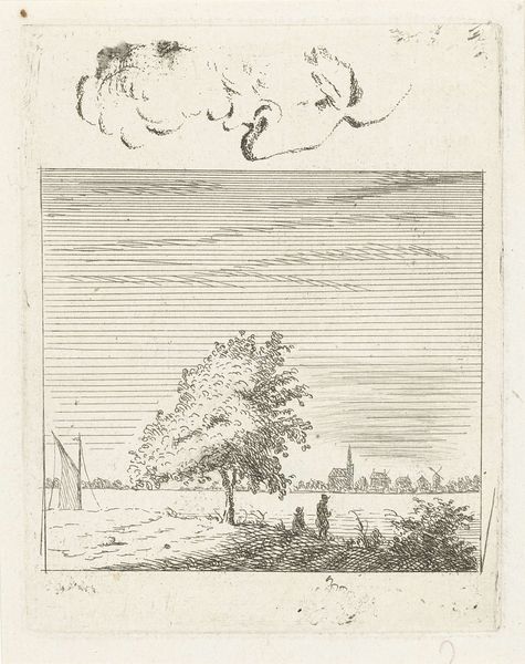 Editor: This is "Juli", an etching and engraving by Simon Fokke, dating from 1722 to 1784. The landscape is quite serene, yet the cross-hatching in the sky feels almost turbulent. What visual symbols do you notice that resonate with the period? Curator: Notice how the composition is almost divided. One side holds the trappings of nobility—the grand building, sculpture, figures, while the other shows a common scene: fishing. Even the clouds above are layered, suggesting different emotional registers. Consider how the windmill symbolizes industry and providence, balanced against the almost staged leisure of the wealthy. Where do your eyes focus first and what story do those elements tell you? Editor: I immediately looked at the people in the boat. The act of fishing feels more immediate, more connected to the land. Is this contrast deliberate, a subtle commentary? Curator: Possibly. Think about Dutch Golden Age paintings – the genre often contrasted wealth with the reality of everyday life, reflecting societal tensions. This print captures a moment in time. It may be romanticizing nature but the overall cultural memory that emerges when we examine the symbolism—nature, wealth, work—shows us values in tension. Does this tension invite contemplation, perhaps even critique? Editor: I see what you mean! I hadn’t really noticed the social commentary, but it's clear now. Looking at how different segments of society were depicted, it offers insight to the period’s anxieties. Curator: Precisely. Visual culture leaves symbolic fingerprints, echoes of their values and anxieties. Understanding them gives insight. Editor: I learned a lot about observing not just what is there but also how to read it. Curator: I agree. Reflecting on images connects us with echoes of the past!