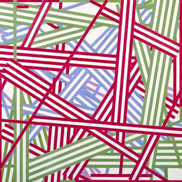 Curator: What do you make of this textile piece, “Composition 34,” from 1930 by Sonia Delaunay? At first glance, its impact seems rather… decorative. Editor: It’s undeniably rhythmic! All those X shapes tumbling across the fabric—it creates a very playful energy, like a skewed game board. The palette is cheerful, but something about its regularity feels manufactured, intentionally commercial even. Curator: Indeed. Delaunay operated at the intersection of fine art and design. She sought to break down those very distinctions, believing abstract forms and colors could revolutionize everyday life. Her textiles, clothing, and interior designs brought avant-garde principles into the domestic sphere. The materials are really where you start to unpack this. Editor: You’re suggesting this isn’t just some pretty pattern? Considering the socio-political landscape in 1930, where industrial production and consumerism were on the rise, do you read something critical here? Perhaps she’s nodding to women's work? Curator: Precisely! The labor involved, both artistic and industrial, is key. The piece embodies the energy and anxieties of modern life, while elevating textile work, which was often dismissed. Editor: And she seems to be working directly against the strict hierarchies of art-making itself by engaging a project, which is both aesthetically captivating and designed for mass production. But beyond its social commentary, don't you find the textile’s flatness—the lack of depth or shading—visually compelling in and of itself? It anticipates the later rise of Minimalism. Curator: Agreed. Delaunay collapses traditional perspectives in favor of surface and pattern. But her engagement with the historical context in her geometric choices cannot be divorced from her status as a migrant escaping violence in Russia. The use of line, therefore, creates a world, perhaps a prison, where one could feel safety by repetition. Editor: An interesting observation! What seems initially ornamental becomes imbued with complex significance when we consider her creative approach in the midst of widespread crisis and patriarchal art systems. Thank you! Curator: Of course. It highlights how domestic crafts reflect back the reality of gendered existence.