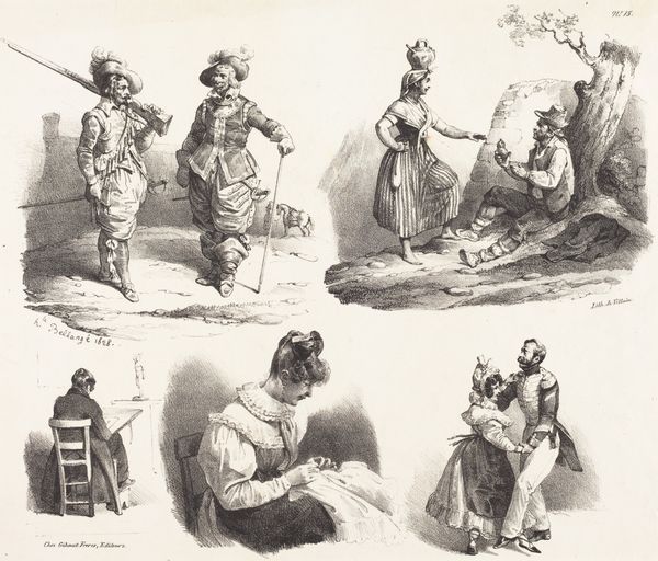 Curator: James Ensor's pencil drawing, "Figures," created between 1880 and 1883, presents a series of loosely rendered characters occupying the same pictorial space. Editor: There's a theatrical, almost dreamlike quality to this composition. It feels fragmented, raw... as if capturing fleeting moments or perhaps subconscious thoughts. Curator: Exactly. Ensor was deeply involved with Symbolism. His figures often function as archetypes, drawn from social observation but amplified through imagination and sometimes caricature. Note how several of these characters are costumed. Editor: The presence of masks, of theatrical dress… definitely infers performance, masquerade. Given Ensor’s historical context, could this be a reflection of the societal tensions, the performance of class and identity, that was building in Belgium at the time? There’s a man collapsing near the bottom; is he overcome by the masquerade? Curator: I see the figure falling as representing the overwhelming sensation of facing reality in the modern era, when one strips off the many masks. There are at least five clusters of figures on the sheet and you notice immediately, how they vary with distinct gestures and expressions. What is consistent is the light source coming down at a diagonal from the upper-left, causing the figures on the upper-right and lower-left to be more obscure, but the collapse and a woman in profile to be bathed in direct light. Editor: That positioning does create an interesting power dynamic through implied visibility. Also, look at the style – it’s like a rapid sketch, revealing the artist’s process and emphasizing spontaneity. You feel his urgency to capture these images and their emotional weight, which is interesting, given its style is so heavily inspired by Romanticism. Curator: Absolutely. And Romanticism allowed for dramatic exploration of feeling, particularly in response to a rapidly changing world. His utilization of Symbolism helped in portraying how he felt about his contemporary social change. The artist would later explore a very distinctive method, by way of oil paintings and etchings, however, in its embryonic stage, as it were, the drawings reveal what would ultimately form the bedrock of a later symbolic construction, and provide valuable insights to the modern day into understanding societal angst and change. Editor: It's fascinating how a simple pencil sketch can encapsulate so much complexity. Ensor used these Figures to reveal the cultural and emotional shifts of his time. Curator: A true testament to the power of art as a symbolic window onto the soul of an era.