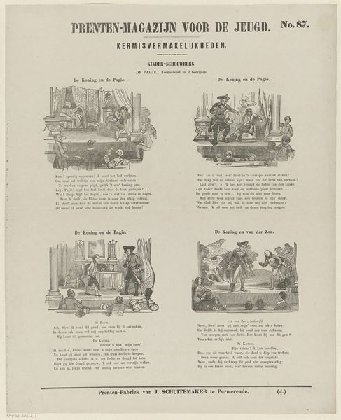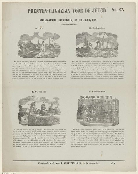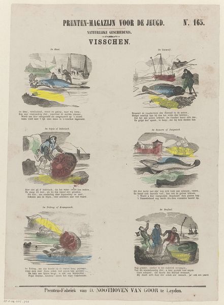 Curator: Here we have "Visschen" by Dirk Noothoven van Goor, an engraving that likely dates between 1850 and 1881. It looks like a page from a children's magazine? Editor: It’s oddly charming. A bit crude, but also humorous with its little vignettes. I'm immediately drawn to the almost caricatured style. It has that appealing old engraving aesthetic. Curator: Van Goor ran a "Prenten-Fabriek," so printmaking was very much his domain, geared toward children's educational materials. These scenes seem to depict different fish, though perhaps not entirely realistically, from "De Haas" to "De Zeewolf" – the Sea Wolf. It seems like they aimed to entertain as much as inform. Editor: The choice of animals to showcase is certainly curious! Beyond merely illustrating aquatic life, they seem like metaphors, archetypes even. A 'sea wolf', a 'trembling crab' these creatures quickly become symbols. Curator: Indeed. Consider how publications shaped understandings of the natural world for young audiences at that time. Beyond scientific accuracy, the visual presentation could reflect prevailing cultural attitudes or moral lessons associated with specific creatures. "De Sepia of Inktvisch", which might translate to 'Sepia the Octopus' is a character with a suitcase, perhaps on a journey. Editor: Look at that octopus character – with its luggage and vaguely human stance. There’s a strong element of storytelling implied within the animal forms themselves. These pictures were undoubtedly effective ways of not only conveying what the animals looked like but also giving these animals identities and backstories for their readers to attach to. Curator: Exactly, and as a form of "natuurlyke geschiedenis", they likely also aimed to impart knowledge about geography and foreign cultures through these animal portrayals. What messages do these images perpetuate, perhaps unconsciously? It's intriguing to speculate on that social level. Editor: A critical aspect is considering the impact on its audience. These were meant to educate, sure, but how do narratives subtly shape their perceptions of "foreignness," "the sea," the creatures that lived outside familiar spaces. These stories are very potent shapers of social outlook. Curator: Thinking about van Goor's “Prenten-Fabriek” on a factory-level – how images got circulated, consumed, what purposes did illustrations serve. The blending of natural history and perhaps folklore makes it intriguing. Editor: Right, the narrative function merges seamlessly with potential ideological or societal influence. Fascinating that even an image meant for children can reflect wider dynamics!
