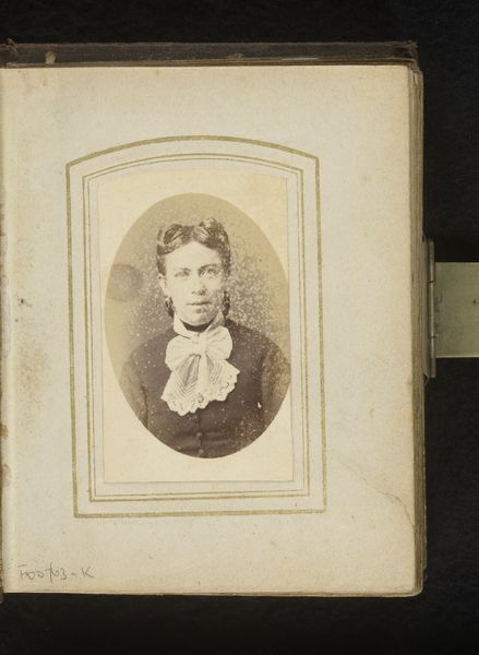 Curator: Welcome. Before us is "Portret van een man met snor en vlinderstrik"—"Portrait of a Man with Moustache and Bowtie"—an albumen print photography likely taken between 1850 and 1880. It appears to be an unadorned, straight-forward portrait, quite typical for the era. Editor: My first impression is one of a reserved sadness. The soft, muted tones of the albumen print, coupled with the subject’s solemn gaze, evoke a certain melancholic air that feels distinctly Victorian. Curator: Yes, the tonality indeed lends a certain gravity. Notice, though, how the photographic technique itself dictates much of the mood. The relatively long exposure times of early photography often resulted in sitters adopting serious, stoic expressions. There is an intrinsic tension, a deliberate choice between subject, frame, and development. Editor: I agree the technical limitations shape it. Yet, the sternness could be interpreted as an assertion of middle-class identity—an intentional contrast to frivolous aristocratic portraiture. A new professional class emerging. What's interesting to consider is that there seems to be almost no historical information regarding the name, social status, or any attribute of the subject; without these pieces, the act of contextualization falls apart. Curator: Perhaps. From a purely compositional view, note the carefully arranged placement of the subject within the oval frame, its subtle lines creating emphasis within a larger rectangular structure. The frame becomes integral; it underscores the man's stillness. The texture is almost sculptural in its stark stillness. Editor: It reminds us that photographic portraits served as accessible keepsakes and symbols of familial connections. To display such artifacts in bourgeois parlors asserted newly empowered claims of family, tradition, legacy. Without its original location as an object from a Victorian-era family photo album, we can still sense a history and memory despite a lack of information about the subject, a kind of melancholic phantom. Curator: Precisely! Regardless of intention, we still come to view, from today's lens, the impact of these formal aesthetic choices—the use of tone, symmetry, and framed form, ultimately define our engagement. Editor: True. Even in its relative austerity, this portrait whispers to us about individual agency within the currents of broader social forces, of how a simple, material image contains an immense set of relations within it, some graspable, most—like our phantom portraitist—likely never fully illuminated.