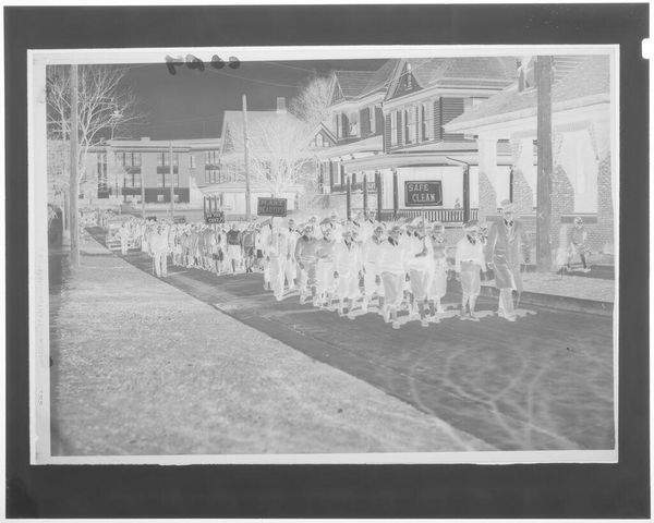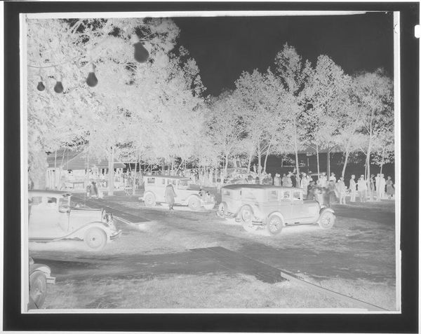 Curator: This image, by Hamblin Studio, presents a crowd gathered at Tuscarona Beach. Editor: It's visually arresting; the high contrast and inverted tones lend it a surreal, almost dreamlike quality. Curator: The negative presents a fascinating look at community, doesn't it? One is left wondering about their social dynamics, who has access, who is excluded. Editor: The composition is quite strong, I'd say. The line of the crowd leads the eye to the background, and the string of lights creates a nice visual rhythm. Curator: I wonder if Hamblin Studio was aware of the historical weight such images would carry. Editor: Perhaps not, but the formal elements speak volumes regardless. The image’s inverted palette certainly challenges our perception. Curator: Indeed, it invites us to consider the photograph's role in shaping collective memory. Editor: A compelling piece, offering both aesthetic intrigue and historical resonance.