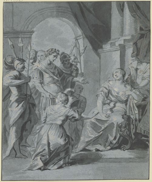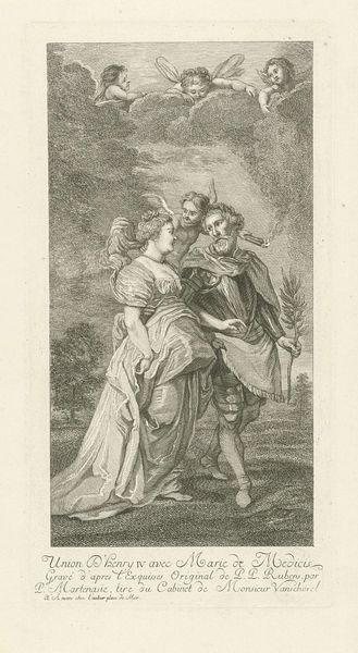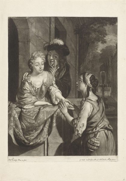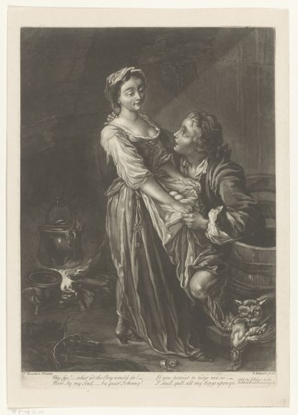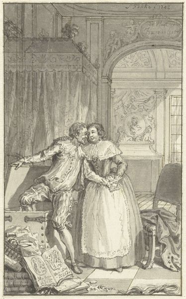 Editor: This is "Illustration med mand med dolk og kvinde," or "Illustration with a man with a dagger and a woman," an engraving from 1800 by Georg Christian Schule. There's a distinct tension here, a sort of melodrama. What do you see in it, considering the context of its creation? Curator: Well, consider the year, 1800. We are on the cusp of a new century, yet firmly entrenched in enlightenment ideals even as revolution rocks Europe. This print, through its dramatic figuration, isn’t just illustrating a scene, it's participating in a conversation about power, vulnerability, and gender roles that were being actively challenged at the time. How might a contemporary audience interpret the power dynamics displayed, knowing the social hierarchies of the era? Editor: So, it’s not just about the action—the implied violence—but also about the statement the artist is making about society? Curator: Precisely! Look at the composition: the man is actively intruding, invading her personal space. The backdrop—the architecture—it acts as a stage on which gendered expectations are playing out. We must consider what messages it sent regarding class and social standing, both for the figures depicted, and for the work's patron. How does that contextualization shift your understanding? Editor: It makes me wonder if the artist intended to critique these power structures, or perhaps reinforce them. Curator: Exactly! And that ambiguity is precisely where the power lies. Art like this provokes conversation; it reflects and shapes our understanding of the world. And even now, the issues the image portrays -- inequality and dominance -- continue to be critically relevant. Editor: I hadn’t thought about it that way, but understanding the historical climate really unlocks a whole new dimension of meaning. Thank you! Curator: It’s all about looking deeper, seeing the connections, and understanding the dialogues art sparks across time.