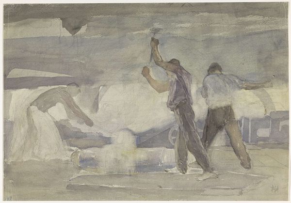 Editor: Here we have Horace Pippin’s 1945 painting, “The Barracks.” The stark scene, rendered in oil, depicts what I presume are soldiers inside their living quarters. There's a heavy mood, almost claustrophobic, yet a strange sense of quiet intimacy too. What feelings or stories does this artwork spark for you? Curator: It’s true, isn't it? Pippin invites us into a world usually unseen, the quiet moments within the machinery of war. Look at the muted palette, the layering of grays and browns, it’s like memory itself, softened and fragmented. He never shies from a truth. And those floating objects, suspended between the bunks; do you read them as religious imagery, or something else entirely? Editor: I hadn’t considered that, but religious imagery makes sense, a reaching towards something spiritual amidst the mundane reality of their lives. What do you make of the subjects' placement and attitudes? Curator: I love that you called them “subjects” – which invites a subtle focus on individuality that’s so important here! Pippin himself served in World War I. What would have that existence been? Wounded and injured, and yet continuing, he’s able to deliver on canvas a perspective from inside that experience. There are figures tending to tasks, some asleep – each frame like a vignette, no heroic flourish, just quiet observation. You can't look away. It is hauntingly beautiful, wouldn't you agree? Editor: I agree completely. It offers such a nuanced and intimate glimpse into a world I hadn’t previously imagined, expanding my understanding of not just war, but also how humanity perseveres within it. Curator: Absolutely, and isn’t that the joy of art, to keep shifting your sightline?