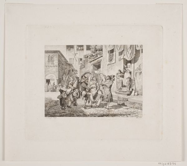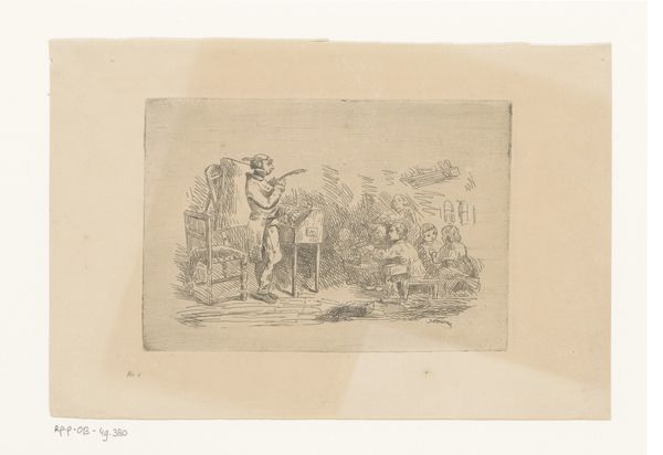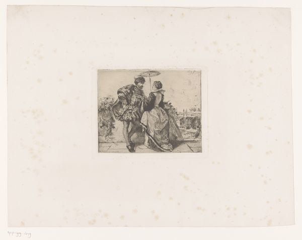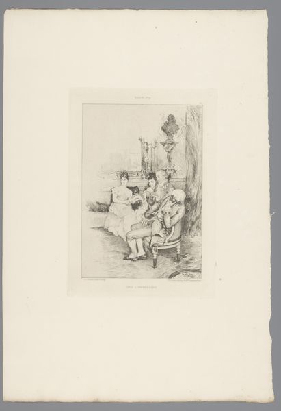 Vilhelm Kyhn created this etching, "Omvandrende musikanter," depicting itinerant musicians. Kyhn, living in 19th-century Denmark, was deeply engaged with national identity, often painting landscapes that evoked a sense of Danishness. Here, though, we see a more intimate scene, perhaps reflective of the social realities of the time. Music, often a communal activity, also served as a means of survival for marginalized groups. The Romani people, for instance, historically faced persecution and relied on their musical talents for income. It is impossible to know the background of these characters, but there is an undeniable sense of poverty. This image presents a stark contrast to the romanticized views of rural life that were common during the national romantic period. Instead, Kyhn offers a glimpse into the lives of those who existed on the fringes of society, suggesting a more complex narrative of belonging and exclusion. While small in scale, the artwork invites us to reflect on the social fabric of 19th-century Denmark, and the lives of those who contributed to its cultural landscape.