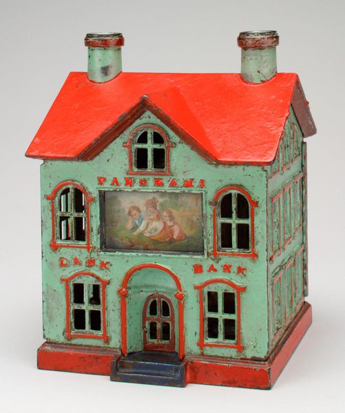 Curator: Right now, we're looking at "-Magic Bank- mechanical bank" made around 1873 by Henry W. Prouty. You'll find it here at the Minneapolis Institute of Art. Editor: It's utterly charming! Such a fascinating object—the form is quite captivating. A miniature building really grabs my attention through its architecture. Curator: Indeed. This isn’t just sculpture, but a mixed-media piece, predominantly metal, shaped to mimic the architecture of the era. It points to how banking was perceived, institutionalized into something as familiar as architecture. The building becomes a promise for future safety and saving for all, right? Editor: Absolutely. The formal choices mimic that architectural promise of stability, the building as icon. Note the use of blue to contour white lines along the facade, with the arched window providing just a peak inside. Curator: It's designed as a playful object that almost romanticizes this notion, obscuring a very complicated financial situation for workers in 1873. In that sense, I'd say the figuration here actually hints at both financial appropriation and security. Editor: That facade feels quite decorative too. See how the form evokes something almost spiritual—not the cold economics one might expect. Curator: Certainly. By using established imagery of historic architecture, Prouty links emerging banking concepts with trust and community values already set in architectural trends, right? The question then is what purpose that appropriation served. Editor: So interesting, thinking about what lies beneath the pretty surface. The semiotics of architectural mimicry opens doors. Curator: The piece encapsulates a very telling social perspective of banking—perhaps even a critical perspective on financial institution’s exploitation through its use of material worth and design. Editor: Agreed. Seeing art from different points really sparks an understanding on different value judgments!