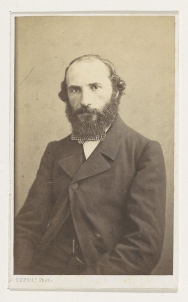 Editor: Here we have a gelatin-silver print simply titled "[James Francis Danby]," taken sometime in the 1860s by John and Charles Watkins. It's currently housed at the Met. There’s something very distinguished, almost imposing, about this man's gaze and impressive beard. What symbols or archetypes jump out at you in this portrait? Curator: The very style of photography immediately calls to mind the Victorian era's fascination with portraiture as a means of immortalizing the self. Notice how the light is meticulously controlled, drawing our attention to Danby's face and beard – the beard itself becomes a symbol. Think about it: what does a substantial beard signify in this era? Editor: Authority? Masculinity? Perhaps even wisdom? Curator: Precisely. But beyond the obvious, consider the deliberate blurring around the edges, a common technique then. It lends the photograph an air of dreamlike unreality, as though we’re seeing a memory. Is it real, or is it something constructed and romanticized? Is this an important man? Editor: That’s fascinating, because it feels very staged, very constructed, like an image trying to portray him in a certain light. What do the eyes suggest? Curator: Look closer. Despite the idealization, there's a hint of melancholy in his eyes, a suggestion of something deeper beneath the surface. In this way, does the photo tell a truthful or truthful portrayal? Do we really know the person depicted, and the role this may or may not have in our cultural memory? The carefully composed image projects authority, yet the subtle emotional nuances hint at vulnerability, challenging a straightforward interpretation. Editor: So it's a play between public image and perhaps a hidden, more personal reality? That's quite powerful for what initially seems like a straightforward portrait. Curator: Exactly. And this tension is what makes the photograph so compelling, forcing us to question the stories we tell ourselves and others through images.