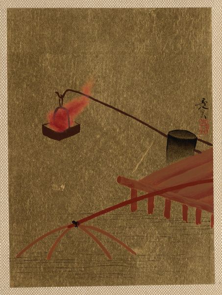 Editor: So, here we have "Lacquer Box and Gourd," a mixed-media painting created sometime between 1807 and 1868 by Shibata Zeshin. It has a fascinating Ukiyo-e aesthetic. I'm immediately struck by how modern it feels with its flat planes and stark contrast. What story can you tell about it? Curator: It's interesting that you find it modern! From a historical perspective, Zeshin was actually revitalizing traditional lacquer techniques during a period of rapid Westernization in Japan. Ukiyo-e woodblock prints were becoming popular and influencing art’s accessibility. Did Zeshin participate in this democratization, do you think, with such playful subject matter? Editor: Definitely a possibility, making art more accessible. Looking closer, the subject matter, the gourd and box, what did they represent? Curator: The gourd, often associated with longevity and good health in Asian cultures, might indicate a desire for a flourishing future during a time of immense social change. The lacquer box suggests refinement, perhaps an elite object now coexisting alongside more commonplace symbols. The contrast in materials itself speaks to social shifts. What are your thoughts on that, knowing the Meiji Restoration was around the corner? Editor: That makes a lot of sense. Presenting both the everyday and elite elements, maybe reflecting on shifting values as Japanese society was restructuring. It almost acts as commentary. Curator: Precisely. Zeshin cleverly employs tradition to engage in a quiet form of social observation, right? How art adapts, absorbs, and subtly critiques the forces reshaping society...it’s quite powerful! Editor: Definitely makes me look at it differently, realizing that, even with a seemingly simple image, artists were reacting and participating in defining social change. Curator: Absolutely, the social and cultural implications are there! That’s what makes art history so engaging!