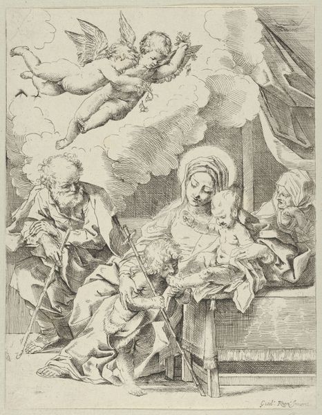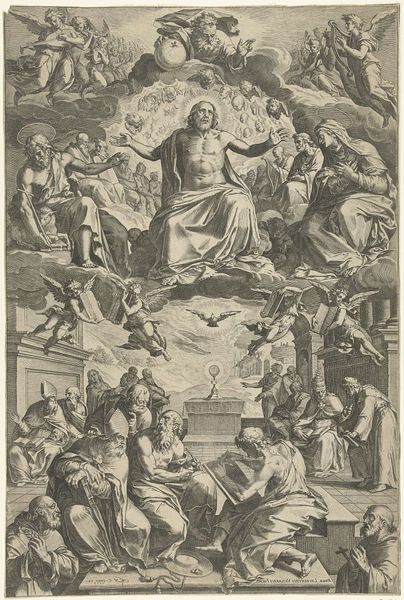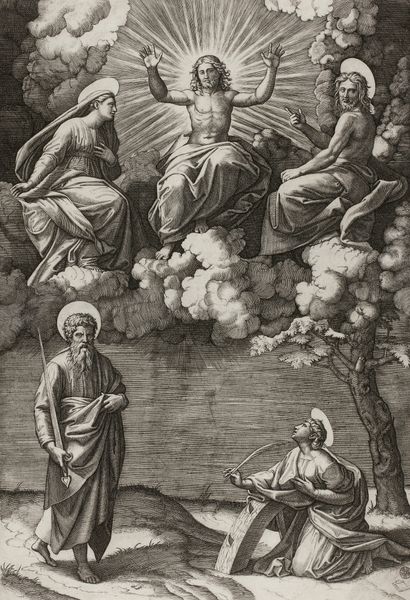 This anonymous engraving presents us with Christ, Mary, John the Baptist, Paul, and Catherine of Alexandria. Christ ascends, haloed in light, arms raised in a gesture that echoes the ancient orans pose, a posture of prayer and supplication found in early Christian art and even pagan antiquity. This gesture, connecting the divine to the earthly, reappears across centuries, morphing from humble plea to triumphant ascension. Consider how the halo, a symbol borrowed from Roman imperial art, marks divinity. Here, it encircles not only Christ but also other holy figures, signifying their sanctified status. This visual language, laden with historical weight, evolves, adapting to new cultural contexts while retaining its primal power to evoke awe and reverence. These symbols, ingrained in our collective memory, tap into subconscious associations, creating a powerful, timeless dialogue between the viewer and the divine.