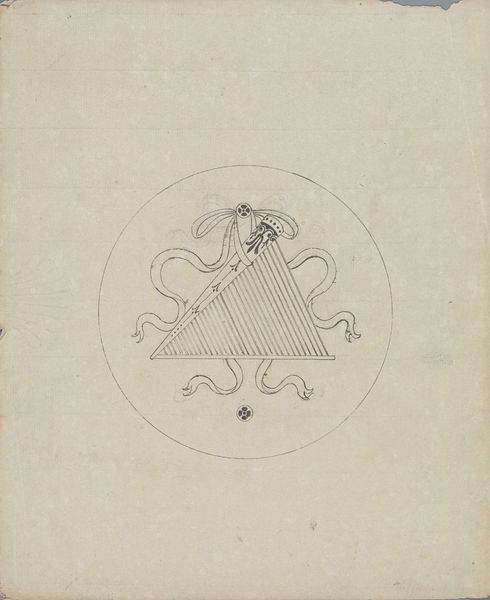 Pierre Félix van Doren created this drawing, "Le Chelys ou la tortine," at an undetermined date, using graphite on paper. The composition is immediately striking for its circular enclosure, within which a stylized lyre dominates. The drawing's lines, though delicate, structure a complex interplay of curves and geometric forms. Van Doren uses the lyre, a classical symbol of harmony and order, to create a pattern. The instrument's strings, rendered as straight, vertical lines, contrast with the fluid ribbons that surround it, creating a visual tension that animates the entire composition. The base of the lyre, adorned with a star, adds a layer of symbolic depth, hinting at aspirations. Note how the precision of the lines suggests a deep engagement with the principles of design and order. This attention to form and structure serves not just an aesthetic purpose but also engages with philosophical concepts of representation, inviting us to decode the underlying meanings embedded within its carefully constructed form.