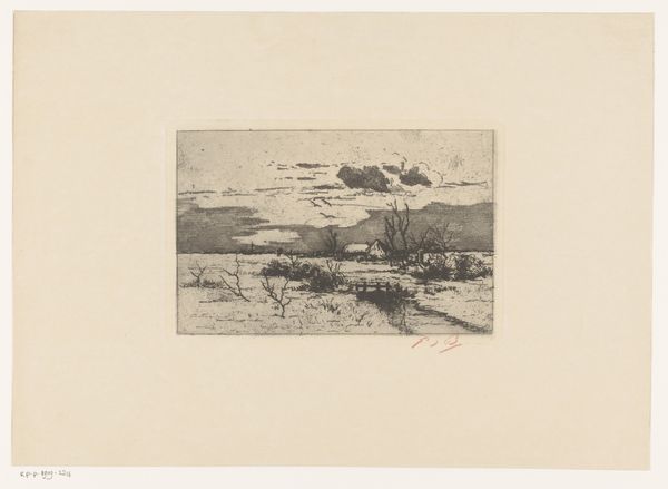 Curator: Immediately, the granular texture pulls you into the rugged beauty of this etching. It's a landscape by John Lübschitz titled "Kattegat," created in 1889. It depicts a coastal scene, currently held at the SMK, the National Gallery of Denmark. Editor: It’s melancholic, almost austere. The stark contrast between the dark rocks in the foreground and the pale sky gives it a weighty feel, as though nature's indifference is on full display. The scale feels very intimate, which, combined with the bleakness, makes for a pretty powerful statement, I'd say. Curator: That weight, I believe, speaks to the intense labor required for printmaking during this period. Each line meticulously etched contributes to the overall mood and texture. Notice the granular pattern that could reflect a comment on the burgeoning industrial landscape overshadowing natural settings, right? Editor: Perhaps. I see it more in the balance Lübschitz achieves between the solid mass of the rocks and the ephemeral quality of the water and sky. The contrast is striking— the ephemeral, lightly drawn sails and the dense rock arrangements on the shore! Curator: But isn't that contrast inherent in the etcher's craft? To translate nature into a reproducible image requires mediating between the observed world and the constraints and capabilities of the medium, in this case, copper or zinc. It allows many more prints for broader sales for example. Editor: Indeed. And in Lübschitz’s capable hands, this particular technique, etching, really emphasizes that inherent graphic quality. Look at the rhythmic use of lines to suggest movement in the water, which then is held back by these clusters of dense rocks. I am just fascinated by the distribution of light. It seems like an emotionally very intelligent depiction, almost Romantic. Curator: And considering its accessibility via printmaking, one might ask: To whom was this image intended to appeal? The rising bourgeois class? Perhaps it romanticizes nature to reflect longing for pre-industrial pastoral serenity, as more folks transitioned to city jobs. Editor: A fascinating thought. Ultimately, "Kattegat" uses careful composition and tonal contrast to explore deeper emotional and aesthetic territories. Its enduring impact relies on its elegant deployment of forms to trigger associations far exceeding simple depiction, whatever social bracket you view it from! Curator: Absolutely. Looking at it now, considering the impact of print media on society and cultural diffusion, I'm compelled by its intersection of production and perception. Editor: And I'm just moved by its raw emotional presence that it manifests within such rigid stylistic boundaries. What a satisfying artistic encounter.