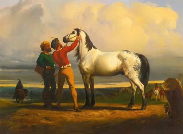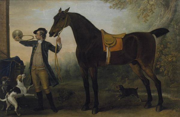 Editor: Here we have "Two Hunters with a Groom" by Jacques Laurent Agasse. It feels like a quiet moment, almost like a stage play frozen in time. What do you see in this piece? Curator: Oh, it’s the quiet drama of unspoken relationships, isn’t it? Agasse captures that stillness right before or after a hunt. I wonder, is it about the bond between humans and animals, or something more…the economics of leisure, perhaps? Editor: The economics of leisure? That’s interesting. I was just thinking about the horses! Curator: Indeed! It’s a glimpse into a world of privilege, sure, but also a quiet moment of companionship. Makes you think, doesn't it? Editor: It does. I hadn't considered it that way. Curator: Art always reveals more layers the longer you look, doesn't it?