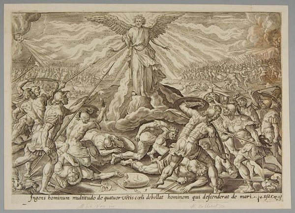 Editor: This is Johann Sadeler’s “Transfiguration,” made around 1600. The expressions are so dramatic! What’s striking to you about how Sadeler uses symbolism in this piece? Curator: Consider the radiant light emanating from Christ, bathing the scene. It's not merely illumination, but a symbolic representation of divine revelation. Doesn't it evoke a sense of overwhelming power? Editor: It does. And the figures of Moses and Elijah, flanking Christ—what’s their significance? Curator: They embody the Law and the Prophets, the foundations of the Old Testament, now converging in the figure of Christ. Think of them as cultural anchors. It's fascinating how Sadeler uses their presence to bridge historical and spiritual narratives. Editor: I hadn’t thought about them as anchors before. I’m beginning to see how deeply this work is embedded in cultural memory. Curator: Precisely! The visual language speaks volumes about the continuity of faith and the power of symbolic representation across generations.