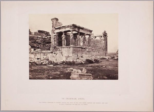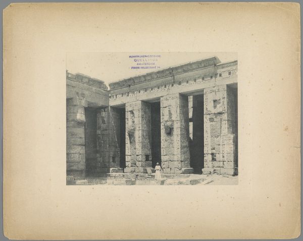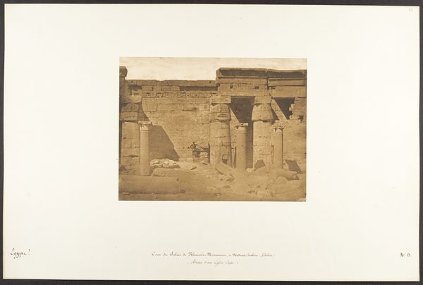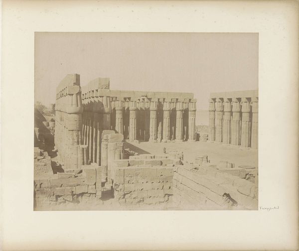 Curator: Standing before us is Maxime Du Camp's 1850 daguerreotype, "Colonnade occidental du Temple de Jupiter, à Baalbek (Héliopolis)," a photographic document of the Temple of Jupiter's western colonnade. Editor: The monumentality of the site really comes through. It is aged, and weathered, but undeniably imposing. I immediately zoom into thinking about the incredible effort involved in quarrying, transporting, and assembling such enormous stones. Curator: It certainly reflects the ambition of Roman imperial power in the region. But I wonder if it's possible to go deeper than marveling at the stones, thinking about labor beyond Roman engineers. How did this represent the politics of its time and even of Du Camp’s era? Editor: That's a very interesting point. We see the end product of imperial ambition. We see it as something monumental and almost devoid of labor in that classical framing. For Du Camp, as for the Romans, the social complexities are erased in favor of aesthetics and an ideal vision of power. Curator: Right. Du Camp presents this colonnade absent of the indigenous communities that would have interacted with, or been directly affected by the construction and function of the site, both then and now. The labor—both enslaved and paid—the political dynamics, are essentially framed out by the photographer. How do we bring those stories to the forefront, considering that photography, in its own right, requires certain labor from those pictured in frame. Editor: What’s also critical for me is thinking about photography in 1850 as a technological marvel – a chemical and physical process tied up with extraction and industrial development. How did these processes tie back to colonial control? We think of it simply as a transparent document. But this work here demands attention to the very real work necessary to produce and fix this image. Curator: Exactly. It allows us to connect what the image shows, and what the materiality of its own making might omit. Considering intersectionality allows for more meaningful questions and contextual understanding of Du Camp's vision. Editor: Indeed. Focusing on materiality and labor exposes the deeply embedded networks of extraction and construction and raises ethical issues that are so urgent now. I appreciate Du Camp bringing up questions like this to the forefront, even if it wasn't intended to do so when it was initially shot.