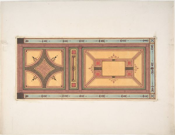 Editor: This drawing, "Design for a Coffered and Painted Ceiling..." made between 1825 and 1900 by John Gregory Crace, it's so delicate, rendered in rust and olive green... it gives me a feeling of quiet luxury, if that makes sense. What catches your eye in this work? Curator: What intrigues me most is how this design reflects the labor and materials inherent in interior decoration during that era. Think about the physical work required to execute such a ceiling, the quarrying of stone for pigments, the preparation of those pigments, the construction of scaffolding. It's not just about aesthetics, it's about production. Editor: So, it's less about the final look, and more about the means of getting there? Curator: Exactly. And beyond that, who was commissioning such a design? What were the social implications of consuming such luxurious goods? Consider also the interplay between what was deemed "high art" and mere craft. Was the artisan seen as just a skilled labourer, or did their creative input hold value? How does the artist's social standing affect the ceiling as an object? Editor: That's fascinating. I hadn’t considered the social context and labor behind a design like this; I was so focused on the colors and pattern! Curator: Often, focusing on materials illuminates that whole world. This drawing is not just an image, it’s a document relating to labour. Editor: I'm definitely going to look at art differently now, considering not just the 'what' but also the 'how' and 'who'. Curator: Indeed! Focusing on these aspects offers insights traditional aesthetic analysis often misses. It shows art to be both a visual item and a component of a material culture.