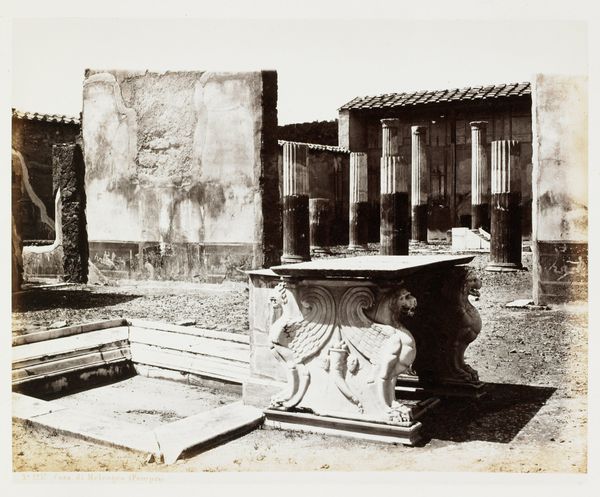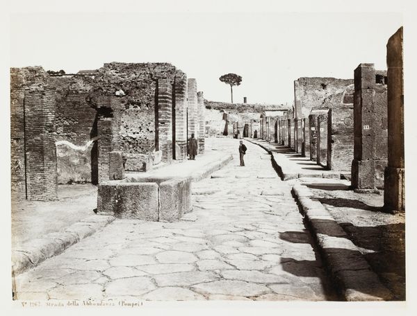 Curator: Immediately, I'm struck by a feeling of melancholic grandeur, almost like a ghost of an empire. Editor: Indeed. This albumen print, titled "Tempio d'Iside," captured in the 19th or early 20th century by Giorgio Sommer, depicts the Temple of Isis in Pompeii. The albumen print process involved coating paper with egg white, lending the photograph a unique texture. Curator: Texture is an interesting point. The ruins, even in photograph, exude a palpable sense of layered history, and the shadows cast across the foreground only heighten the sense of time's relentless march. What can this tell us about our relationship with cultural memory and resilience, and with deities like Isis in ancient culture? Editor: The material reality tells us plenty, though. Notice how the crumbling columns bear the brunt of centuries of neglect. The decay is part of the material story, it connects this once sacred space with the volcanic ash that buried it, to the later excavation that led Sommer to take this image in Italy. Curator: The site clearly carries strong symbols; those pillars and the visible brick underneath call to mind cycles of destruction and reconstruction – potent metaphors embedded in our psyche. The almost theatrical contrast between light and shadow creates a sort of liminal space, between reverence and ruin, making visible the power of nature’s capacity for renewal and erasure, mirrored in our own cultural narratives. Editor: It is the tangible nature of the material here, for me. The wear and tear on each individual column tells of labor and also connects to commerce, from quarrying and shipping these columns. Who had access? Who didn’t? The print offers the means to trace this historical impact. The medium itself connects the temple's historical existence to our present-day consumption and memory. Curator: It’s remarkable how a single image can act as a conduit, relaying whispers from the past, isn't it? I feel like the figure on the left of the frame adds an air of mourning—connecting ancient reverence to contemporary grief over lost ways. Editor: Definitely, and in how this particular photograph memorializes labor and the slow process of decay of once sacred objects. By turning our gaze toward the temple ruins, it invites speculation about our role in consumption, destruction, and our fleeting impact on what may persist after us.