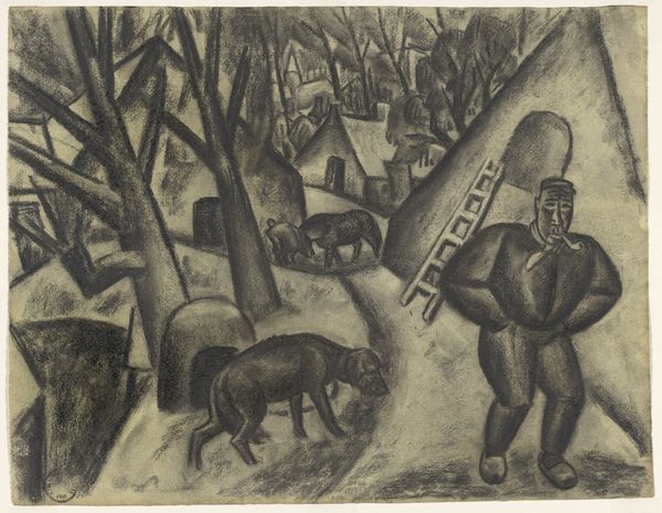 Curator: Here we have a tempera painting called "Winter. Red Hill in the realm of Berendey" by Boris Grigoriev. Editor: It feels like a fever dream – a jumble of winter imagery fractured and reassembled. There's a haunting quality, with that skeletal tree looming large. Curator: The painting does display some clear characteristics of the Russian Avant-Garde. Note how Grigoriev destabilizes perspective through fragmentation. The hill isn't simply red, but segmented. Editor: Red often signifies danger, revolution. Paired with "winter", that red hill becomes even more potent; a landscape gripped by an almost violent cold, awaiting rebirth, perhaps? Curator: Precisely! It also plays with shallow space through a compressed arrangement of its planes. Notice, too, how the forms don't completely resolve. Are those birds? Or simply more abstracted shapes relating to one another through color? Editor: Look at the anthropomorphic qualities of the trees, as though they’re watchful guardians of some ancient realm. This makes the whole scene dreamlike. There’s also a vulnerable figure huddled low against the snowy foreground. What story does it hold? Curator: The title itself, mentioning "Berendey," might hint at a deeper narrative. In Rimsky-Korsakov's opera, "The Snow Maiden," the realm of Berendey is a world of ancient Slavic myth. This adds another layer to what you point out about the painting's storytelling possibilities. Editor: Perhaps Grigoriev is subtly incorporating pre-Christian beliefs into the frigid landscape. It's as though those folkloric images have burrowed their way beneath layers of snow, history, and the veneer of the Russian avant-garde. Curator: Indeed. The ambiguity enhances its allure. What appeared purely formal in my first assessment expands when those readings get added. Editor: It all contributes to its complex power. One senses so many invisible narratives stirring below its surface. A chilling, striking creation.