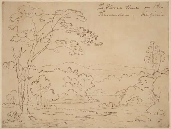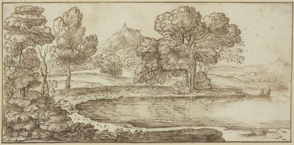 This drawing, whose author is unknown, presents us with a riverscape traced in delicate lines of ink on paper. Dominating the left side, the intricate network of trees creates a screen that directs our gaze toward a serene panorama of mountains and water. The composition here functions as a study in contrasts, where the rough texture of the foliage and rocks in the foreground meets the smooth, horizontal expanse of the river. The artist plays with perspective, inviting us to contemplate the relationship between near and far, solid and fluid. A semiotic analysis reveals how the motif of bathing figures suggests themes of purification and the body's connection to nature. Note how the detailed rendering of natural forms isn't just representational; it's a meditation on the act of seeing and understanding our place within the larger order of nature. As we consider this work, we are reminded that art is always a process of inquiry, a continual questioning of what we know and how we perceive the world.