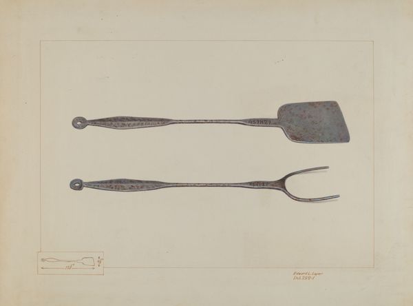 Curator: This is "Silver Knife and Fork," a pencil drawing made around 1935 by A. Zimet. Editor: My first thought is the quiet elegance, that refined simplicity you often find lingering just before everything changes. It's like a whisper of a different time. Curator: It's interesting you mention quiet, as it seems very much a product of its time. We can really see Zimet's detailed work in the drawing technique. The rendering gives them form. It gives them weight, especially for disposable objects, perhaps reflecting on their cost and significance at this time. Editor: Precisely. The almost photorealistic rendering elevates them, transforms utensils into things worth contemplating. And pencil—such a humble tool to capture something of value. Curator: Zimet’s focus on these specific items might also speak to the changing dynamics of domestic labor and consumption during the 1930s. Utensils like these represented a growing availability of consumer goods. They imply, in some respects, a higher standard of living. The artist isolates the forms of labour embedded in everyday practices. Editor: I wonder, what were these used for in the context of life back then? It's not just art imitating life, but holding up a mirror to aspirations. They seem timeless. The drawing, the details… almost an homage. It transcends the functional. Curator: Absolutely. By drawing our attention to what might be overlooked, Zimet reveals broader truths. It makes us question where things come from, how they are made, what it means to possess certain things. It definitely is thought-provoking. Editor: It does make you reflect. From my perspective as an artist, there’s something captivating about that simplicity—the choice of material, subject and quiet grandeur in something as ordinary as silverware. Curator: A truly astute reflection on the era it both reflects and seeks to transcend. Editor: I am very glad we had the opportunity to explore this unassuming artwork together.