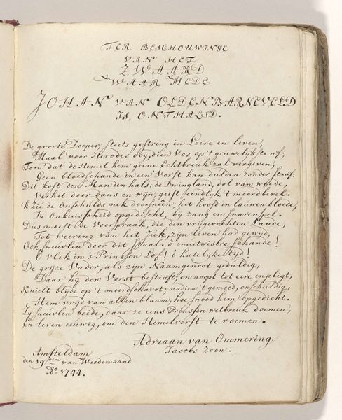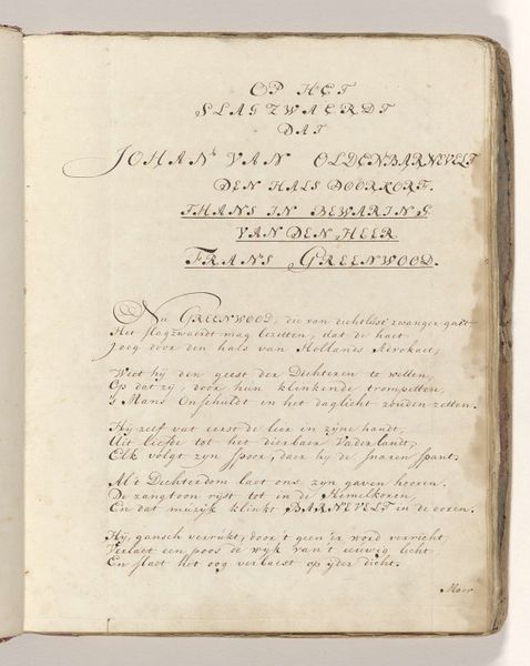 This is a poem, written by Frans de Haes in the 18th century, reflecting on the sword said to have beheaded Johan van Oldenbarnevelt in 1619. The text, inscribed with ink on paper, speaks volumes about the cultural significance attributed to objects and events in history. Here, the act of writing itself becomes a means of imbuing the sword with layers of meaning. The poem reflects a society grappling with themes of justice, sacrifice, and the weight of history. The very act of inscription elevates the sword beyond a mere weapon. Consider the labor involved, not only in the physical act of writing but also in the intellectual work of crafting language. This poem blurs the lines between craft and fine art. It asks us to consider how the act of making, whether with a sword or a pen, shapes our understanding of the past and our place within it.